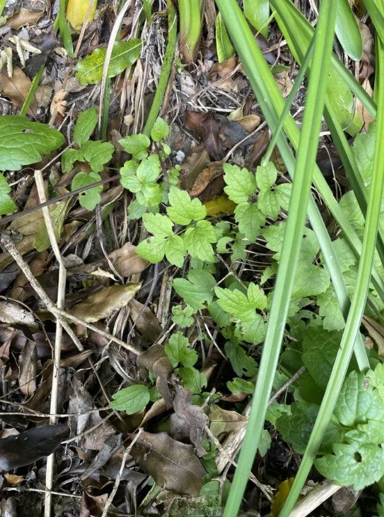 The frustrating thing with OMB is that it seeds everywhere and will root down wherever its stems touch the ground. What I particularly noticed today, was that we are getting a nice thick leaf litter under the trees, which suppresses grass. However, OMB sees this as a prime place to send out runners and root down in multiple places.