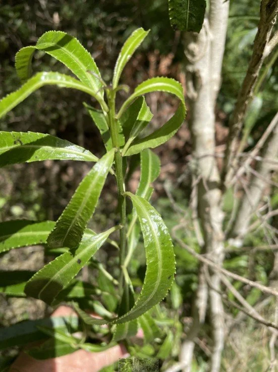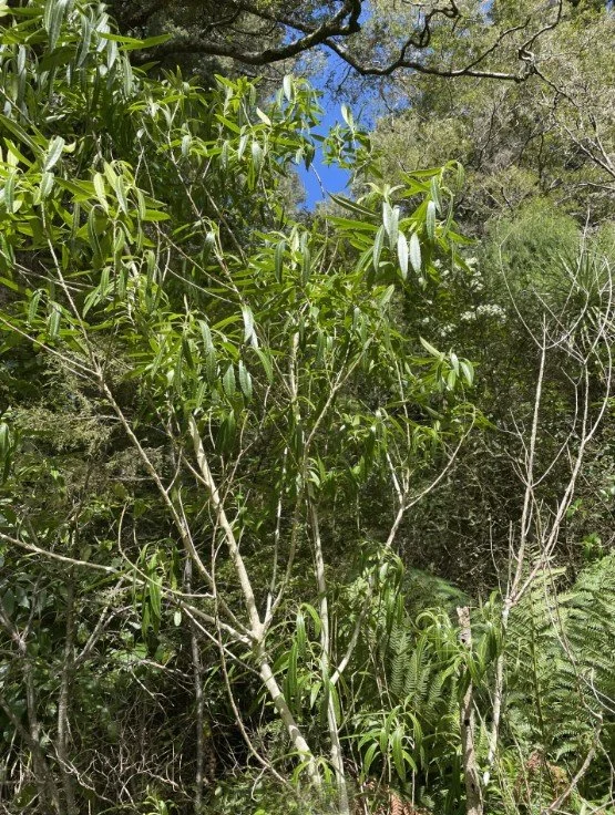 We observed this distinctive tree, with it’s lovely shiny leaves, in the Onamalutu Reserve. It is a small, bushy tree, that prefers high rainfall areas. It has downward curving, tough, shiny narrow leaves on a short stem, 5-16cm long and 0.5-2cm wide. The leaves may be slightly serrated along the margin. They can resemble willow leaves. Flowers are small and fragrant, with yellow or dark purple petals and are scattered in groups along the twig.