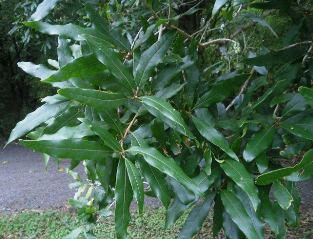 It has long, narrow, dark green leaves, arranged in opposite pairs. The leaves are between 7-15cm long and 1.5-4.5cm wide, with a leathery feel. They have a pronounced sunken midrib on the upper surface and clearly visible veins on the pale green underside.