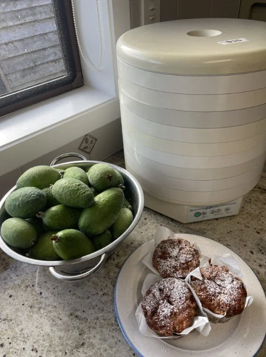 With such an abundance of these New Zealand favourites, we are busy stewing, dehydrating and baking with this fragrant fruit. Here is the Feijoa Muffin recipe we used for our morning tea today. A couple of tips - use Texas muffin pans and line with squares of baking paper. This is cheaper than muffin cases, and looks more generous!